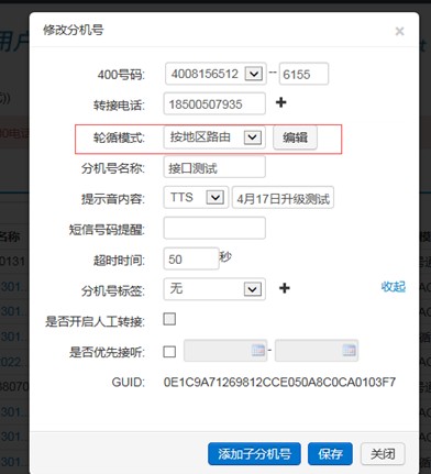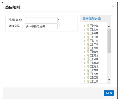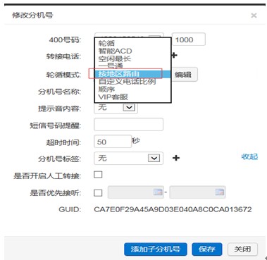 地区路由:根据主叫的归属地或所在地转接给相应地区的接线员。 两种实现方式, 第一种拨完400号码,根据主叫判断坐席。 操作流程: 管理员先开通400号码的路由模式并打开直播用户,进入“精准营销后台”:代理商后台——1000号分机号管理——编辑——轮询模式选择“按地区路由” (如图示) 1、规则名称:可填写省市名称,以方便后台管理; 2、转接号码:接线员电话号码,可设置多个; 3、省市信息:可按省份选择,也可按省份下地区选择。 第二种拨完400号码后,拨通分机号根据地区路由判断坐席。 操作流程: 管理员不用开通400号码的路由模式,400大号设置为转分机形式。后续操作如第一种。 (责任编辑:admin) |