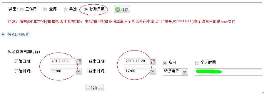 非工作时间的特殊日期设置: 开始日期9:00到结束日期的17:00,这几天的所有时间来电都会转到137*****这个电话上。