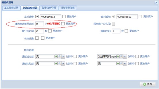 为控制恶意回拨电话,语音系统做了升级: 1.每一分钟检测一次语音数据库,如果同一主叫在一天之内呼叫次数超过“同一主叫每天每呼叫次数”设定值,此主叫加入该企业24小时黑名单。 2.如果同一主叫在一个代理商下一天之内有3个企业加入了24小时黑名单,则此主叫升级为该代理商24小时黑名单。 3.如果同一主叫在整个平台的呼叫次数超过50次,该主叫加入系统黑名单,有效期永久。 (责任编辑:admin) |